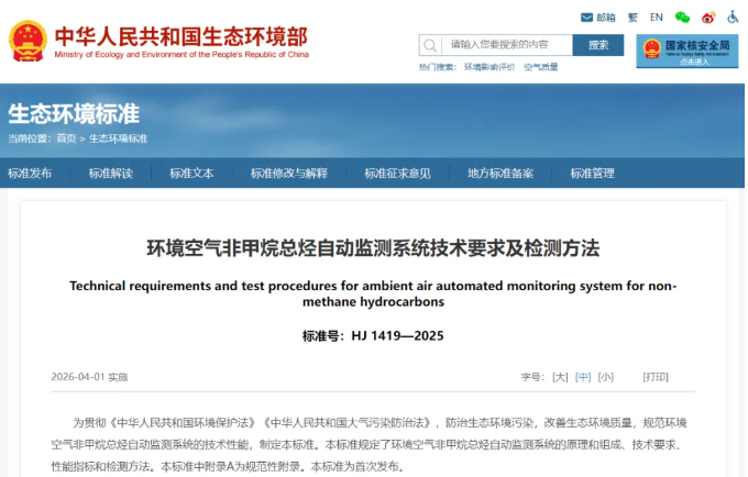 為貫徹《中華人民共和國環境保護法》《中華人民共和國大氣污染防治法》,防治生態環境污染,改善生態環境質量,規范環境空氣非甲烷總烴自動監測系統的技術性能,生態環境部制定國家生態環境標準《環境空氣非甲烷總烴自動監測系統技術要求及檢測方法(HJ 1419—2025)》。本標準為首次發布,自2026年4月1日起實施。